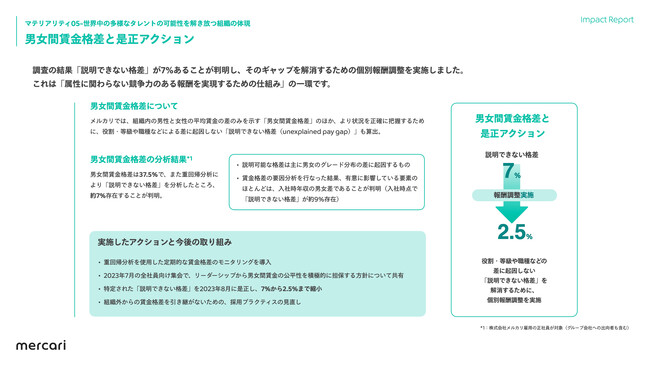 メルカリでは、組織内の男性と女性の平均賃金の差のみを示す「男女間賃金格差」のほか、より状況を正確に把握するために、役割・等級や職種などによる差に起因しない「説明できない格差(unexplained pay gap)」の算出も行っています。その結果、男女間賃金格差は37.5%、役割・等級や職種などの差に起因しない「説明できない格差」が7%存在したことがわかりました。特定された「説明できない格差」は是正措置で報酬調整を実施し、2.5%まで縮小することができました。今後も、重回帰分析を使用した定期的な賃金格差のモニタリングや、組織外からの賃金格差を引き継がないための採用プラクティスの見直しなど、継続的な取り組みを実施していきます。