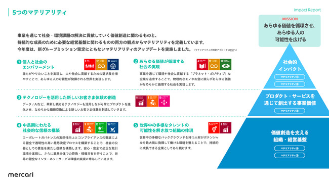 また、グループミッションの策定に伴い、メルカリが取り組むべき重点課題である「5つのマテリアリティ」のアップデートも実施しています。