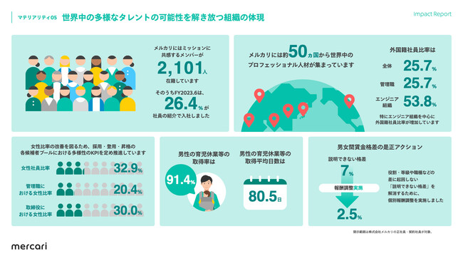 2023年度の「Impact Report」では、メルカリの事業を通じた環境へのポジティブインパクト(削減貢献量)の算出結果や今回はじめて開示を行った「男女間賃金格差」に関するデータの公開など、「5つのマテリアリティ」ごとに実施したアクションをまとめています。