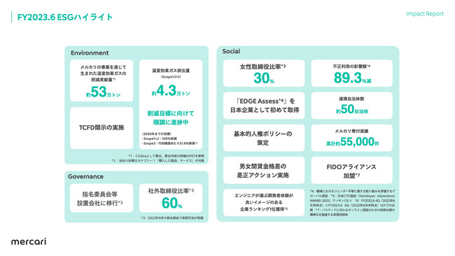 株式会社メルカリ(以下、メルカリ)は、ESG推進に向けて2023年度に取り組んだ活動とその結果をまとめた「FY2023.6 Impact Report」(インパクトレポート、以下「Impact Report」)を公開しましたので、お知らせいたします。