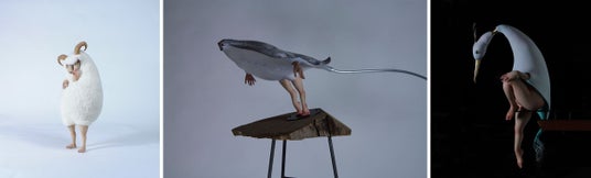 人間らしさとは何だろうという視点から動物を見つめ、似ているところと似ていないところを融合し、どちらともつかない生き物を作っています。