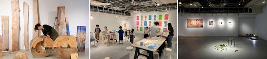 ▲(画像左)制作の様子、(画像中央)キッズワークショップの様子、(画像右)成果展の様子