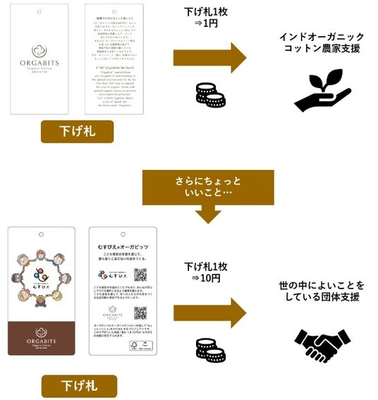 ORGABITSを使用した商品1点につき1円を、インドのコットン農家を支援する「一般財団法人 PEACE BY PEACE COTTON」に贈呈しています。