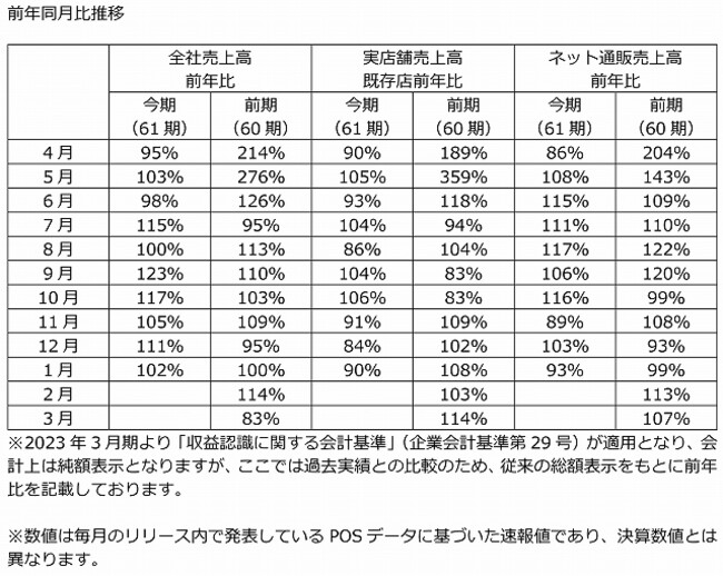 株式会社セキド(本社・東京都新宿区、社長・関戸正実、証券コード:9878)は、2023年1月度(12月21日~1月20日)の売上高が、全社の前年比102%、GINZALoveLove実店舗の既存店前年比90%、ネット通販の前年比93%となりました。なお、数値はPOSデータに基づいた速報値であり、決算数値とは異なります。