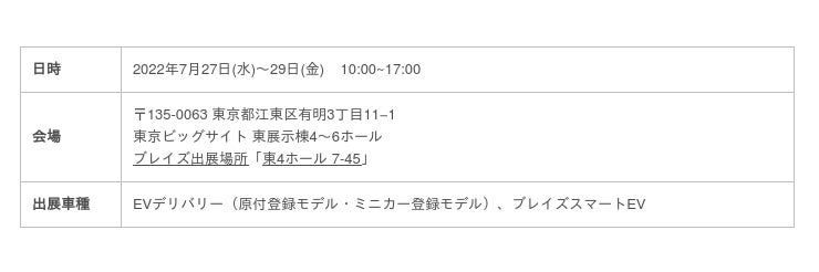 ブレイズからは、宅配に特化した3輪電動バイク「EVデリバリー(原付登録モデル・ミニカー登録モデル)」、小型で個人の配達員にも人気の2輪電動バイク「ブレイズスマートEV」を出展します。