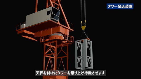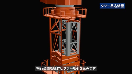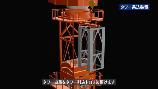 ※1 タワークレーンが工事の進行に合わせて自力で上昇するクライミング工程を指し、主に2つの方式があります。「マストクライミング方式」は支柱を継ぎ足して上昇する方法で、一般的な高層建築に多く採用。「フロアクライミング方式」は建物の床を利用して台座ごと上階へ移動し、超高層鉄骨建築で主に運用されます。