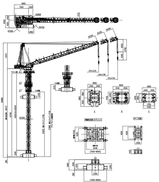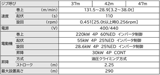 クライミング作業では、まず天秤を取り付けたタワーをクレーン自体で吊り上げて待機させます。続いて、昇降体の引き込みトロリに掛け替え、トロリで支えながら、横行装置を操作してタワーを引き込みます。1本あたりの作業時間は約2時間と短く、従来のフロアクライミング方式では2日かかっていた作業を1日で完了でき、大幅な時間短縮を可能にしました。また、上面にタワー取り込み口が不要になったことで、旋回体の構造をコンパクトにできるため、1,000t・m級クレーンでありながら、600t・m級クラスの旋回体サイズを実現しました。旋回体の後部が短いため、敷地外への越境や周囲への干渉リスクも低減します。さらに、クライミング時に使用するアウトマスト上部は脱着式で、取り外すことで最上階でのクライミング作業に必要な台座引き上げの伸びしろが確保できます。クレーン本体とクライミング装置が独立して動く構造により、上昇作業後すぐにクレーンを使用できるのも大きな利点です。また、作業中もジブ方向を360度回転させることができ、ジブの長さも37m・42m・47mの3段階で調節が可能です。建設現場において、作業効率と安全性が大幅に向上し、超高層建築における施工の可能性をさらに広げます。