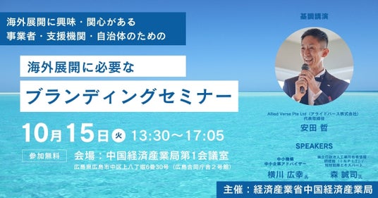 企業のマーケティングDXを支援するアライドアーキテクツ株式会社(東京都渋谷区、代表取締役社長 CEO:中村壮秀、証券コード:6081)は、当社海外子会社Allied Verse Pte Ltd(アライドバース株式会社)の代表取締役である安田哲が、経済産業省中国経済産業局主催の「海外展開に興味・関心のある事業者・支援機関・自治体のための海外展開に必要なブランディングセミナー」に基調講演者として登壇することをお知らせいたします。