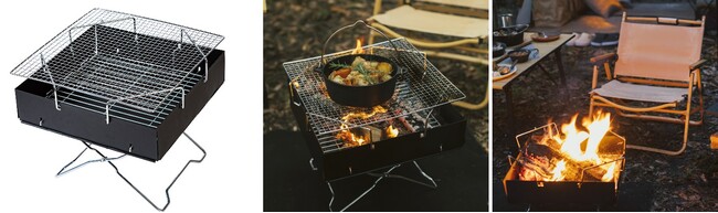 BBQコンロとしても網を外して焚火台としても使用可能。収納時の厚さわずか35mm(約)。