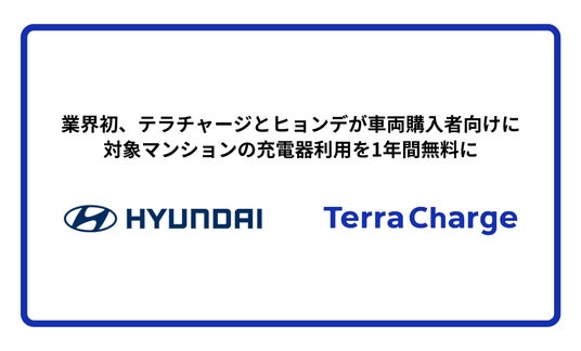 電気自動車(EV)向け充電サービスを展開するTerra Charge 株式会社(本社:東京都港区、代表取締役社長:徳重徹、以下テラチャージ)は、Hyundai Mobility Japan株式会社(本社:神奈川県横浜市西区、代表取締役社長:趙源祥、以下ヒョンデ)と協業する企画の第一弾として、キャンペーン期間中にヒョンデ車両購入者に向けて対象エリアのテラチャージの充電設備が設置されているマンションでのEV充電の利用を1年間無料にするキャンペーンを開始しました。