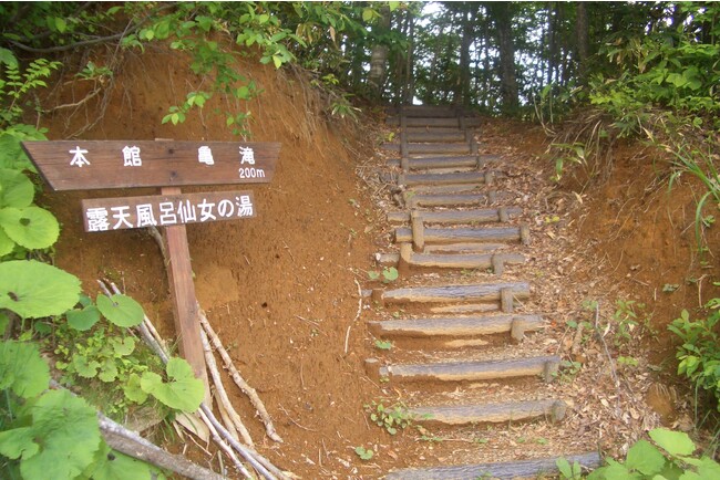 ホテルから約200m、森の中を抜け、V字の「湯ノ沢」の谷底に続く階段を降りたところに「仙女の湯」があります。昭和40年代に、スタッフがホテルの裏山を探検していたところ沢筋に滝を見つけ、『このロケーションに露天風呂があったら最高に気持ちがいいだろな』と話題になり、念願が叶って「仙女の湯」が誕生しました。山道で重機を入れられないため人力で作られていますが、今では雫石町の温泉を象徴する露天風呂として、観光パンフレットにも紹介されています。