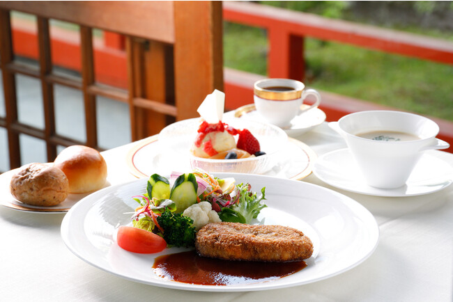 数年前までメインダイニングルーム「三笠」の一品料理として人気を博していた洋食の定番ビーフカツ。今回は期間限定でスープ、パン、デザートと共にコース仕立てでご提供いたします。