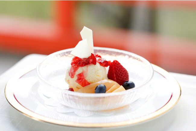 デザートには、1890年代に、ロンドンの有名ホテルで考案されたとってもキュートなピーチメルバが登場。バニラアイスに桃やラズベリーの風味が混ざり合い、甘くてフルーティーな味わいが楽しめるシンプル&クラシックなスイーツです。