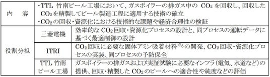 今般、排ガス中のCO2回収技術の社会実装に向けた次のステップとして、当社とITRIは、飲料の製造工程で排出されるCO2の利活用を目指すTTL竹南ビール工場と、CO2を回収・資源化する実証試験に関する基本協定を締結しました。本協定の中で3者は、TTL竹南ビール工場において、ガスボイラーの排ガス中のCO2を回収し、回収したCO2を精製してビール製造工程に適用する技術の確立と、CO2の回収・資源化における技術的な課題や経済合理性の検証に取り組みます。本実証試験を通して、当社とITRIはCCU技術の研究開発を加速し、TTL竹南ビール工場は、工場から排出されるCO2排出量の削減と、回収したCO2の自社利用を目指します。