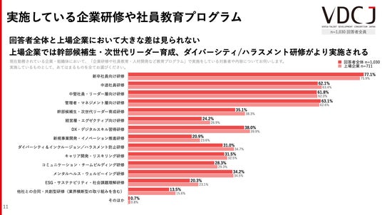 新入社員(新卒・中途)向けの研修のほかに、中堅社員・リーダー向け、管理者・マネジメント層向け研修の実施傾向が高い。上場企業においては幹部候補生・次世代リーダー育成研修、ダイバーシティ&インクルージョン/ハラスメント防止研修がより実施されている。