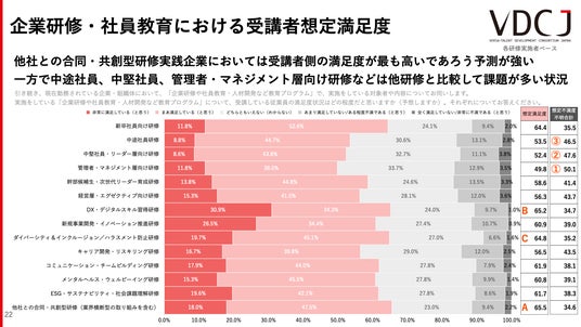 別設問(完全版レポートに結果掲載)にて他者との合同・共創型研修を実践していると回答した企業においては受講者の満足度はより高いと想定されている。全体の傾向としては、中途社員向け、中堅社員向け、管理者/マネジメント層向けの研修においては想定満足度が低く、課題意識が顕著。