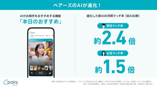 恋活・婚活マッチングアプリ「Pairs(ペアーズ)」を運営する株式会社エウレカ(本社:東京都港区、代表取締役CEO:山本竜馬、以下 ペアーズ)は、2024年10月から順次導入を開始した推薦AIにより、「いいね」を送ったお相手とマッチする確率(マッチ率)が大幅に向上しました。