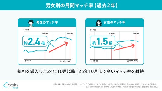 具体的には、アプリトップに表示される「本日のおすすめ」機能において、勧められたお相手に「いいね」を送って「マッチ」するマッチ率が、旧AI(2024年9月時点)と新AI(2025年9月時点)の比較で男性は約2.4倍、女性も約1.5倍に向上しました※1。