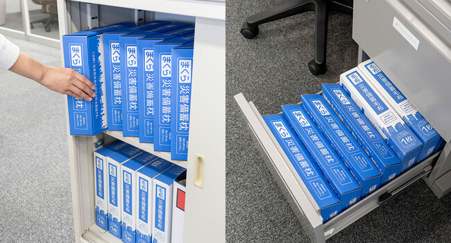 「災害備蓄枕」は、まるで本のような見た目の圧縮された枕。A4サイズとほぼ同じ大きさの箱に入っており、オフィスの棚や各自のデスク引き出し・ロッカーにも収納することができます。また、かさばらないので、持ち運びや配布も速やかに行うことができます。