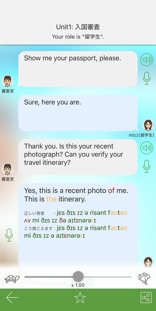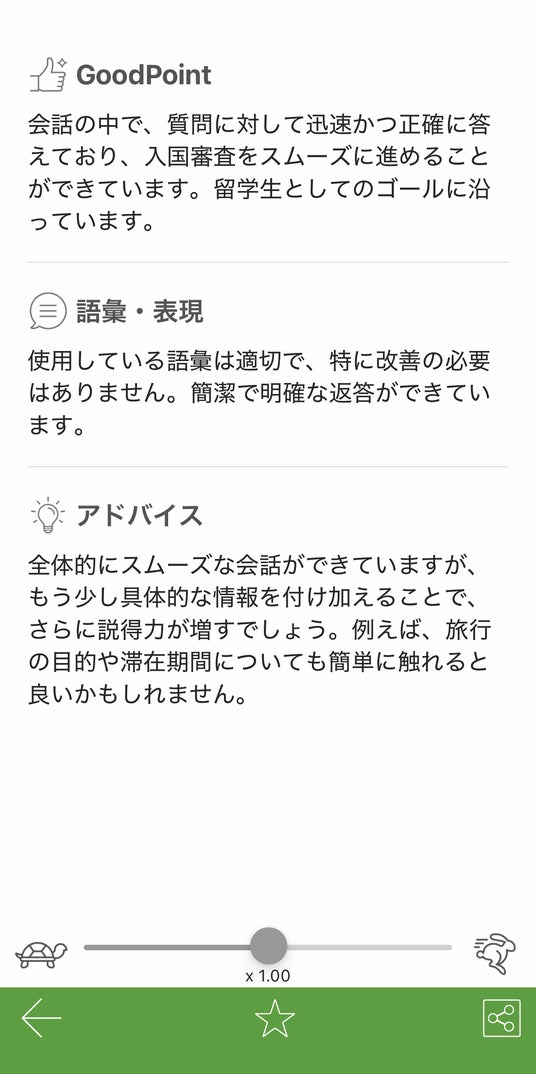 学習者(ユーザー)は「留学生」のロール(役割)になりきり、AIが演じる入国審査官、客室乗務員、ホストファミリー、カフェの店員などの英語話者を相手に英語で会話をしていきます。英語が思いつかない場合は、日本語で話せばその内容の英語訳が表示されるので、それを読み上げることで英会話ができます。自分の発話はAIによる発音チェックが可能。決められたターンの会話が終わると、良かった点、語彙や表現の改善点、今後のアドバイスなどをAIがフィードバックをしてくれます。