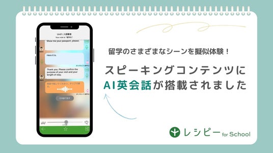 株式会社ポリグロッツ(本社:東京都新宿区、代表取締役:山口隼也)は、最新の英語ニュースはじめ豊富なコンテンツで英語の6技能(読む、聞く、書く、話す+単語と文法)を伸ばせる英語学習プラットフォーム『レシピー for School』にて、AI英会話機能を搭載いたしました。