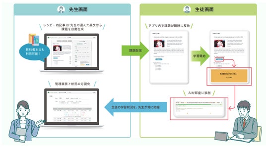 『レシピー for School』内の記事や動画コンテンツ、あるいは教科書や先生の選んだ記事を入力するだけで、授業や宿題に活用できる単語や内容理解の問題、ライティング・ディスカッションのトピックなどをAIが自動で生成します。この機能により、問題作成や採点、さらに生徒ごとの学習の進捗状況といった先生の負担が大幅に軽減されます。