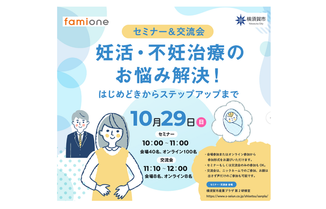 「子どもを願うすべての人によりそい 幸せな人生を歩める社会をつくる」をビジョンに掲げ、LINEを活用した妊活コンシェルジュサービス「famione(ファミワン)」 https://lp.famione.com/ を提供する株式会社ファミワン(本社:東京都渋谷区、代表取締役:石川勇介、以下当社)は、神奈川県横須賀市が主催する2023年10月29日(日)開催の妊活セミナー&交流会 「妊活・不妊治療のお悩み解決!~はじめどきからステップアップまで~」に、ファミワンの公認心理師・臨床心理士の戸田と生殖相談士・看護師石橋が登壇することをお知らせ致します。