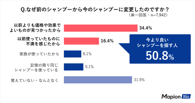トップは「以前よりも価格や効果でよいものが見つかったから」が34.4%でした。続いて「覚えていない・何となく」の31.9%でした。また、3位は「以前使っていたものに不満を感じたから」(16.4%)で、1位の「以前よりも価格や効果でよいものが見つかったから」と合わせると半数以上(50.8%)の人がより良いシャンプーを探して変更した経験があることが分かりました。
