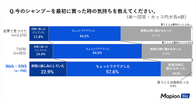 次に、今使っているシャンプーを最初に購入した際の感情を見てみると、「Web・SNS」を選んだ人は「非常に楽しみにしていた」(22.9%)、「ちょっとワクワクした」(57.6%)を合わせると8割以上の人がポジティブな感情で買い物体験をしていることがわかりました。