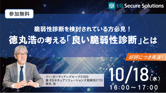イー・ガーディアン株式会社(https://www.e-guardian.co.jp/ 東京都港区 代表取締役社長:高谷 康久 以下、「イー・ガーディアン」)のグループ会社であるEGセキュアソリューションズ株式会社(https://www.eg-secure.co.jp/ 東京都港区 代表取締役:高谷 康久 以下、「EGセキュアソリューションズ」)は、10月18日(水)16時よりオンラインセミナー『脆弱性診断を検討されている方必見!徳丸浩の考える「良い脆弱性診断」とは』を開催することをお知らせいたします。