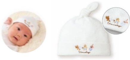 ソフトな肌ざわりの国産の生地を使用。国内で1枚1枚丁寧につくっています。生まれてすぐの赤ちゃんも被ることができる小さめサイズです。