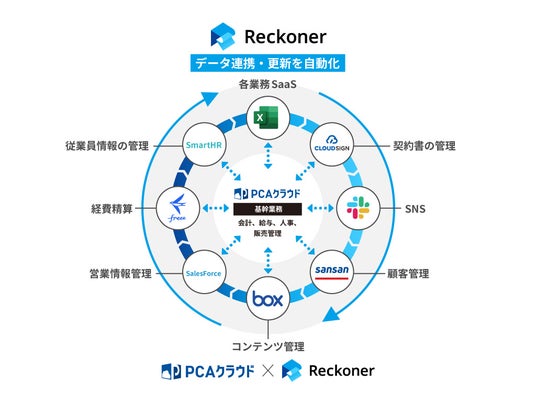 「PCAクラウド」は、インターネットを通じて簡単かつ低コストで利用できる基幹業務ソフトです。会計・販売管理・人事給与をはじめ、税務など幅広い業務をサポートします。一方、データ連携ツール「Reckoner」は、データの集約・加工・連携をノーコードで誰でも簡単に実行できるクラウドサービスです。