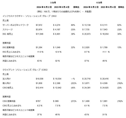 インフラストラクチャー ソリューションズ グループ(ISG)の第2四半期の売上高は、前年同期比38%増の116億ドルでした。サーバーおよびネットワークの売上高は、AIと既存のサーバーの両方にわたって需要が拡大し、前年同期比80%増で過去最高となる77億ドルでした。ストレージの売上高は前年同期比5%減の40億ドル、営業利益は13億ドルでした。