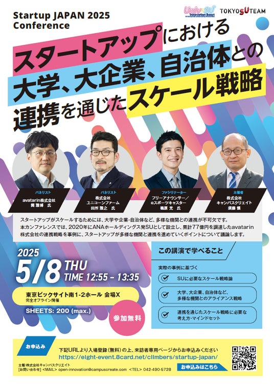 株式会社キャンパスクリエイトは、「Startup JAPAN 2025」にて「スタートアップにおける大学・大企業・自治体との連携を通じたスケール戦略」をテーマとしたカンファレンスを主催いたします。