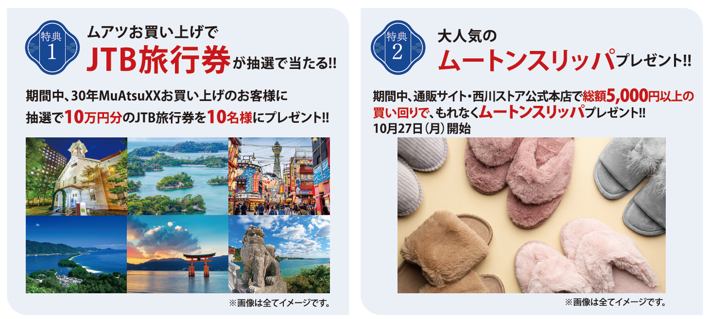 昭和西川株式会社(所在地:東京都中央区、代表:西川惠)では、「昭和西川 大創業祭」を、10月31日(金)から11月3日(月・祝)までの4日間、全国の昭和西川直営店および通販サイト「西川ストア公式本店」で開催します(西川ストア公式本店は11月4日(火)9:59まで)。ムアツをご購入いただいた方を対象に、旅行券やクーポンなど豪華賞品が当たる抽選キャンペーンに加え、店頭がMuAtsu(ムアツ)ブルーに染まる来店イベントも実施。直営店・通販サイトで同時に楽しめる、年に一度の特別なキャンペーンです。