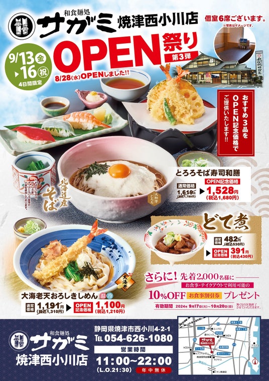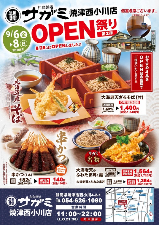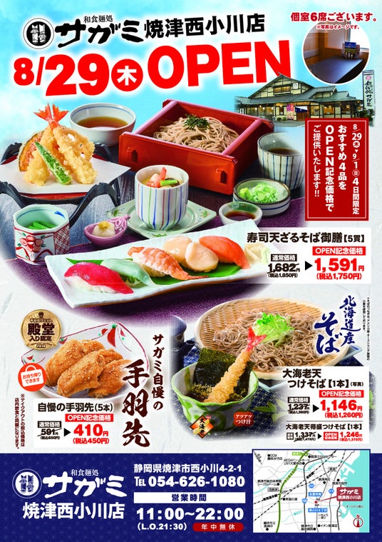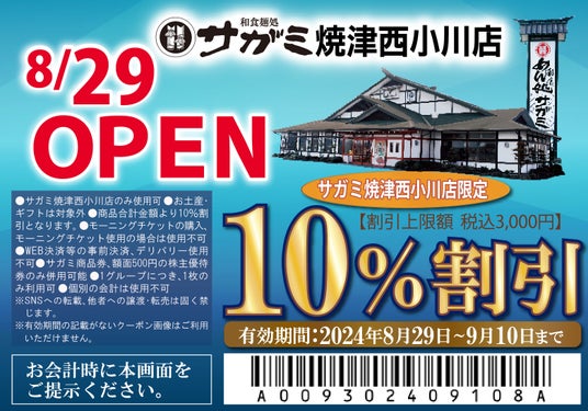 株式会社サガミホールディングスのグループ企業であるサガミレストランツ株式会社(本社:愛知県名古屋市守山区八剣二丁目118番地 代表取締役社長 鷲津 年春)は、2024年8月28日(水)にオープン予定であった、「和食麺処サガミ焼津西小川店」ですが、台風10号の影響により2024年8月29日(木)へ変更しグランドオープンいたします。