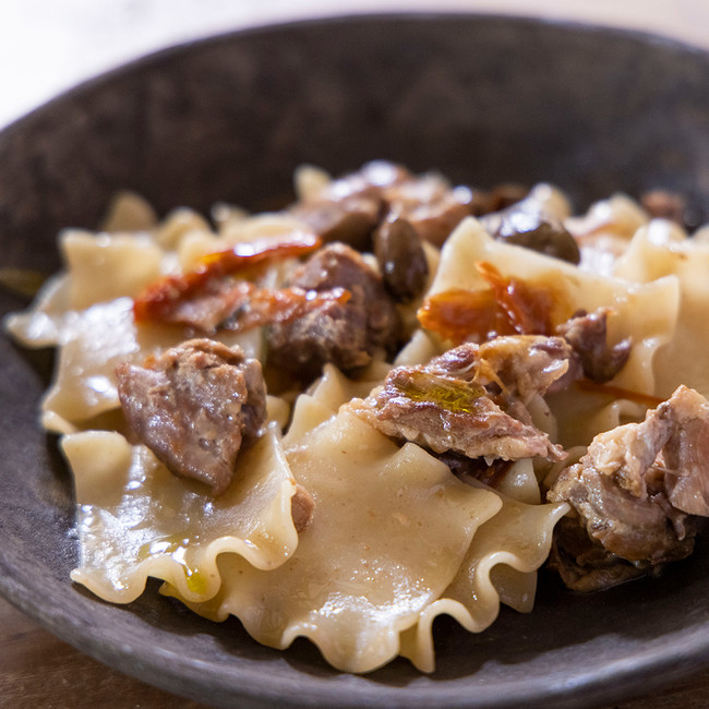 ホロホロ鳥とドライトマト オリーブのパスタソース ¥1,620(税抜¥1,500)