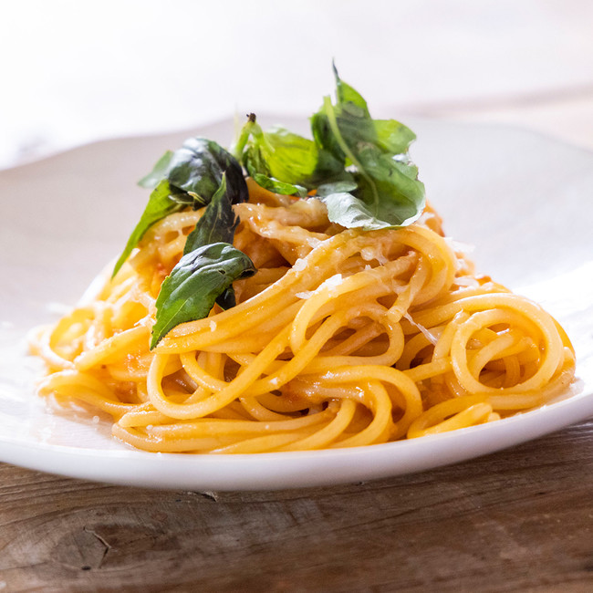 トマトのおいしさを追求したパスタソースです。自家農園のトマトから作るピューレに、ローストして芳ばしい風味をプラスしたミニトマト、良質なエキストラバージンオリーブオイルをたっぷりと加えました。冷蔵庫でソース缶ごと冷やし、冷製パスタにしても。また、焼きナスにかけてマリネしたり、チーズと共にオーブン焼きにしたり、ガスパチョのように冷やしてトーストしたパンと合わせてもおいしくお召し上がりいただけます。