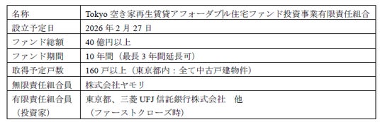 三菱UFJ信託銀行株式会社(取締役社長:窪田 博、以下「三菱UFJ信託銀行」)は、東京都の公募事業で株式会社ヤモリ(代表取締役:藤澤 正太郎、以下「ヤモリ社」)が運営事業者として選定された、子育て世帯等が住みやすいアフォーダブル住宅※1を供給する「官民連携アフォーダブル住宅供給促進ファンド(以下、「本ファンド」)」へ出資することを決定いたしました。