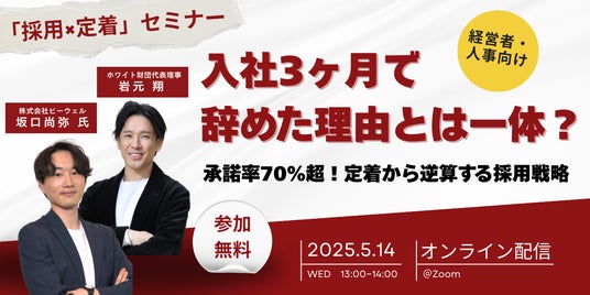 ホワイト企業認定を展開する一般財団法人 日本次世代企業普及機構(本部:大阪市北区、代表理事:岩元翔)は、2025年5月14日(水)に無料オンラインセミナー「入社3ヶ月で辞めた理由とは一体? 承諾率70%超!定着から逆算する採用戦略」を開催いたします。