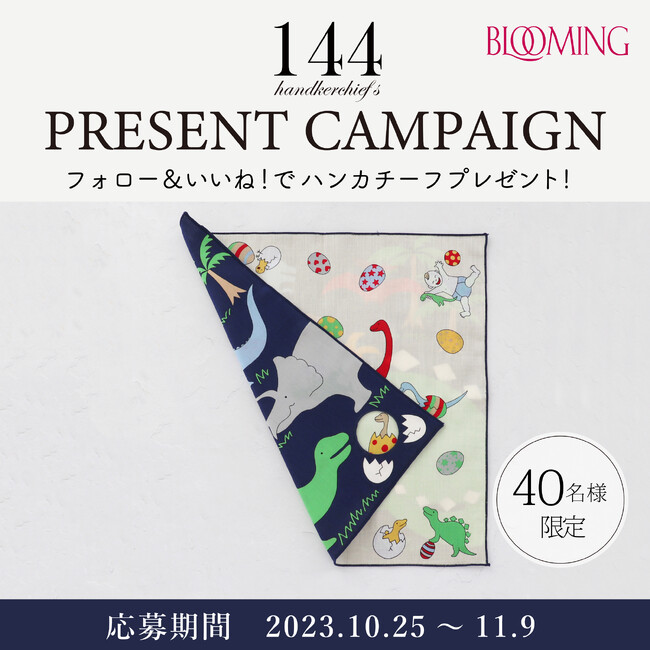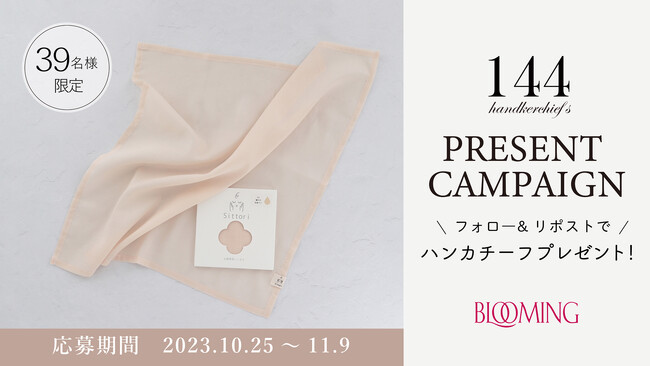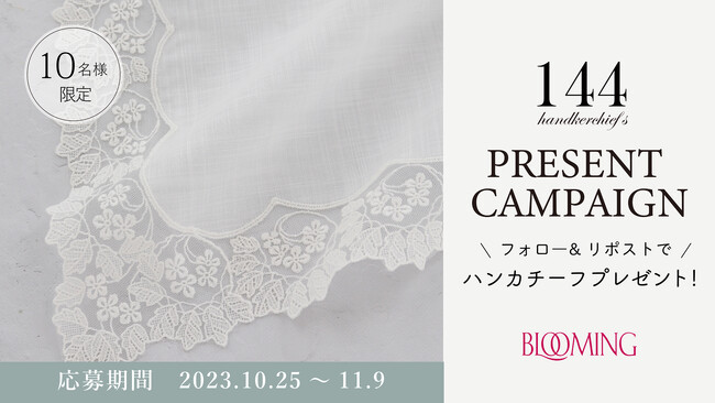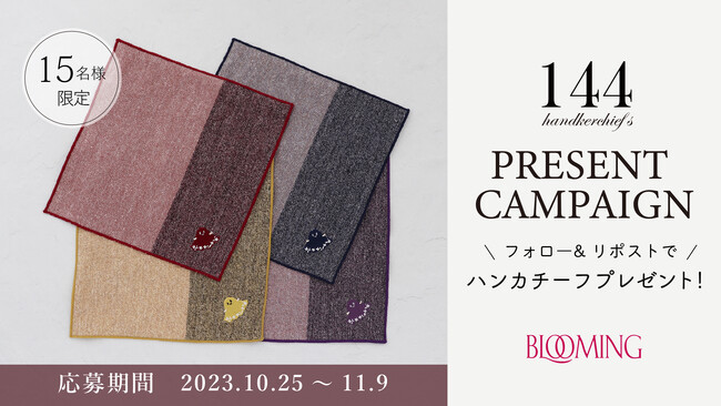 繊維製品を企画販売するブルーミング中西株式会社(本社 東京都中央区 取締役社長:中西一)は、おかげさまで2023年11月16日(木)に創業144周年を迎えます。日頃の感謝の気持ちを込めて、144枚のハンカチーフが当たるプレゼントキャンペーンを開催いたします。