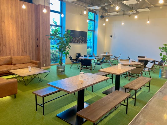 サテライト型シェアオフィスブランド「H¹T(エイチワンティー)」との提携店舗で、よりワークや勉強に集中するための1人席や、友人や家族とゆっくり過ごすカフェ席が店内だけでなく店外にも配置されており、多様な座席でSHARE LOUNGEをお楽しみいただけます。LOVOTの「かめてぃ」と「くろっきー」が皆様をお迎えします。