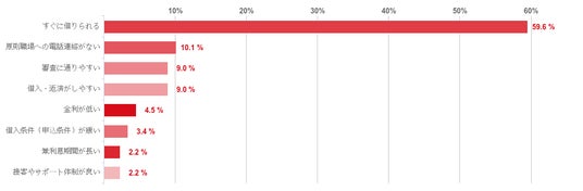 アコムのメリットには、「すぐに借りられる」ことを挙げた人が圧倒的に多かった。なお、そのほかには、「職場への電話連絡がない」「審査に通りやすい」「借入・返済がしやすい」などが挙がった。