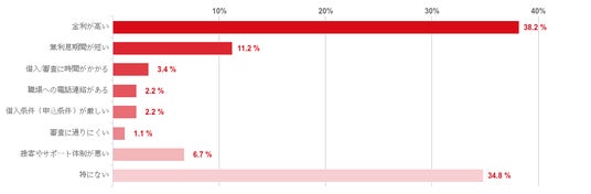 一方、アコムの改善点には、「金利が高い」ことを挙げた人が38.2%で最も多く、「無利息期間が短い」ことを指摘した人も11.2%いた。