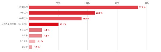 アコムの審査結果が通知されるまでの時間は、「1時間以内」が最も多く37.1%、続いて「30分以内」が22.5%、「3時間以内」が18%となった。