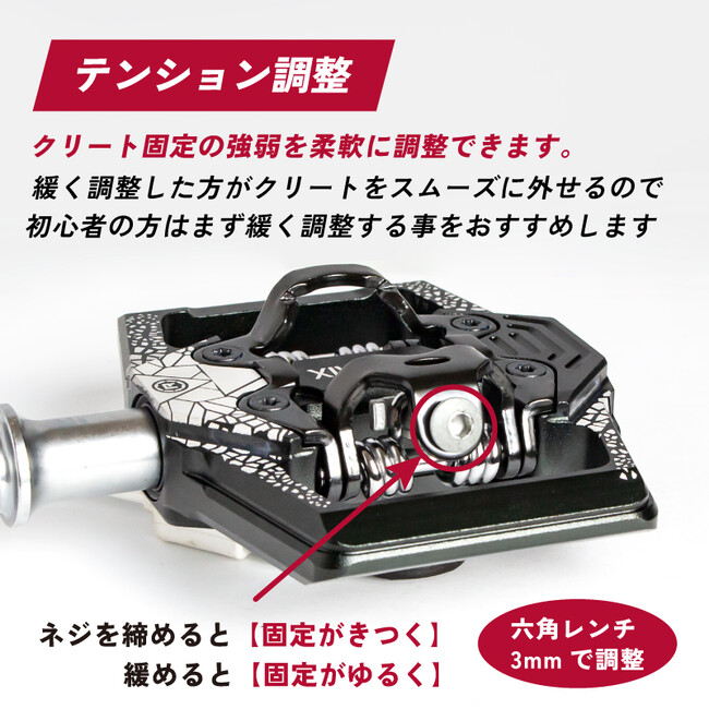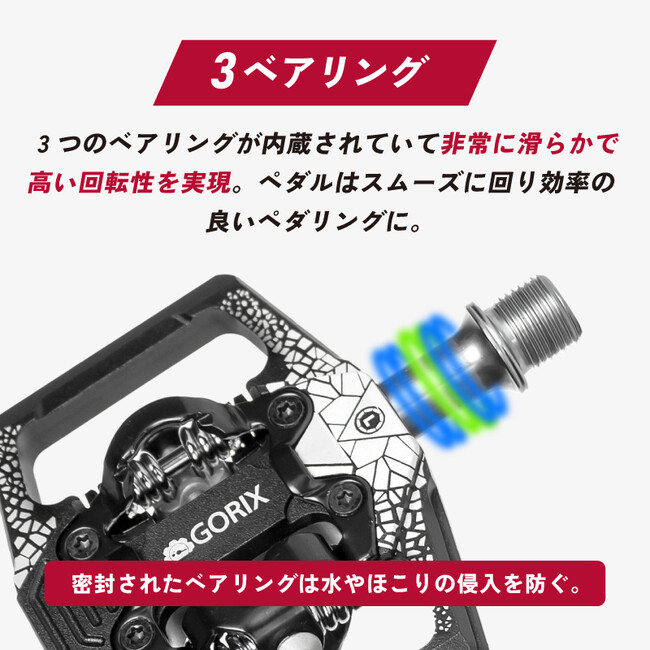 ロードバイクやクロスバイク、MTBなどに最適な、両面ビンディングペダルです。負荷を均一に分散するトリプルベアリングを配置。3ベアリングで回転も滑らかで、ペダルはスムーズに回ります。