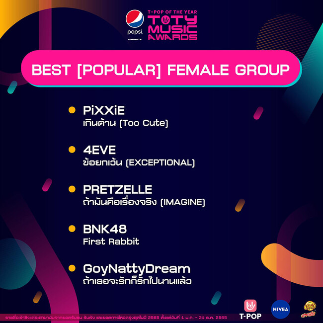 PRETZELLEが、タイのポップミュージック授賞式ライブ「TOTY MUSIC AWARDS」にて 「BEST [POPULAR] FEMALE GROUP」 にノミネートされました。