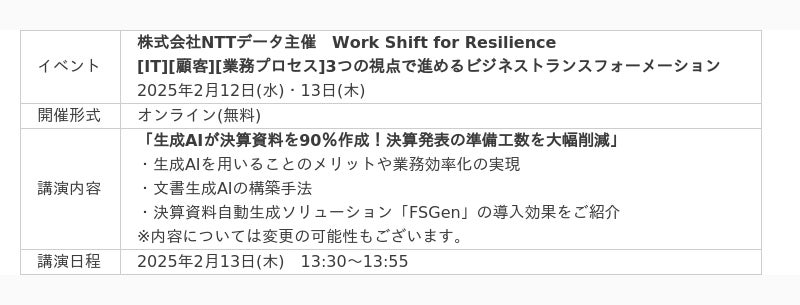 株式会社ニーズウェル(本社:東京都千代田区、代表取締役会長兼社長 船津浩三)は、2025年2月12日(水)・13日(木)開催の株式会社NTTデータ主催オンラインイベント「Work Shift for Resilience」に、当社が登壇しますのでお知らせいたします。