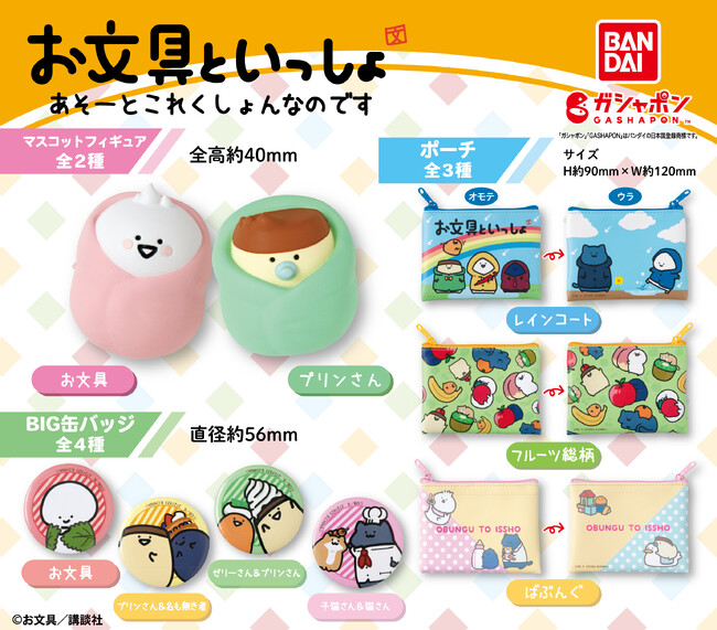 株式会社バンダイ ベンダー事業部(本社:東京都台東区)は、SNSを中心に4コマ漫画やアニメを展開している『お文具といっしょ』からマスコットフィギュア、ポーチ、缶バッジがラインアップに入った、「お文具といっしょ あそーとこれくしょんなのです」(1回400円・税10%込、全9種)を2024年6月第3週から順次、全国のガシャポンバンダイオフィシャルショップ、玩具売り場・量販店・家電店などに設置されたガシャポン自販機シリーズにて発売いたします。