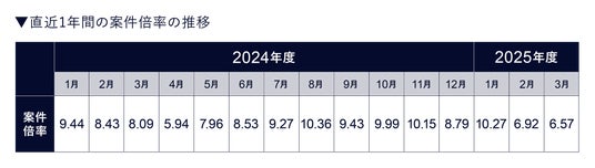 2025年1月から3月において、案件数・案件を探すフリーランスともに、前年度同時期よりも増加し、案件倍率は、1月:10.27倍、2月:6.92倍、3月:6.57倍、四半期累計では7.80倍となりました。